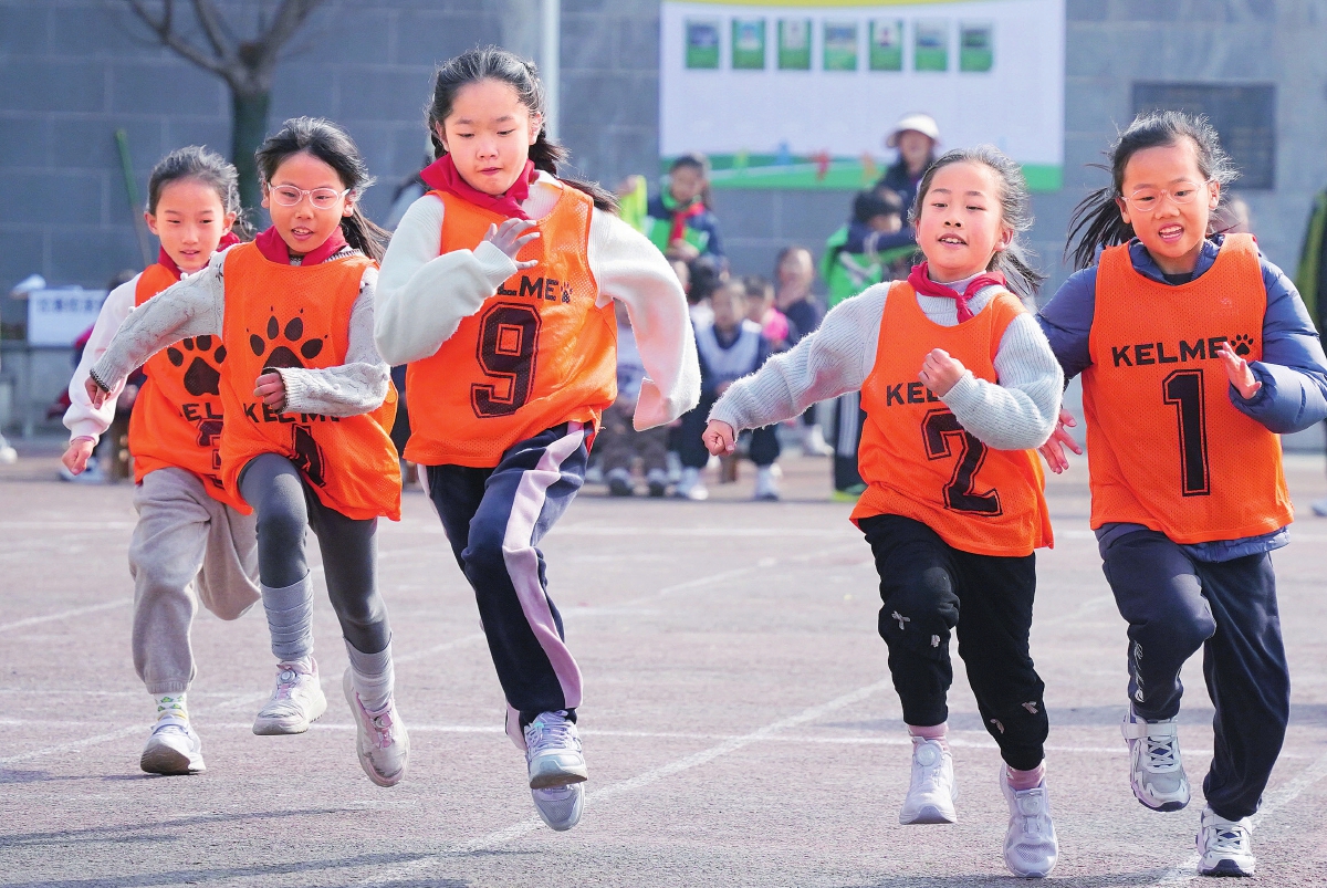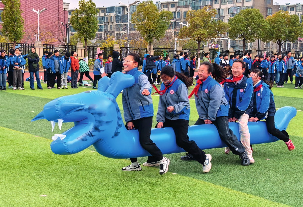 在江苏省南京市晓庄小学开展的“趣享运动”冬季趣味活动中,队员们有的参加骑羊角球、赶“猪”跑运动项目,有的参加“齐头并进”“袋鼠跳”运动项目,有的参加“球行万里”“陆地龙舟”运动项目……队员们在趣味运动中强健体魄、磨炼意志。