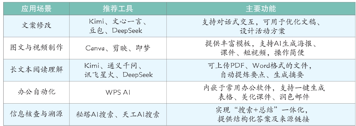 少先队辅导员无须精通所有AI软件,但应了解不同类型工具的功能定位,做到“对症下药”。结合日常工作实际,我推荐5类适配性较高的AI工具,供大家参考(见下表)。