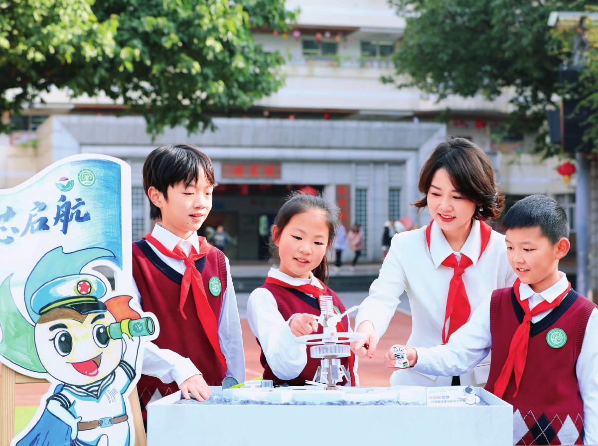 贾渝(右二)带领队员们开展校园科技活动