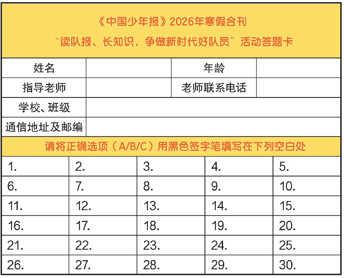 3.请将答题卡于2026年4月15日前(以邮局邮戳为准)寄回本报,信封上注明“读队报、长知识”字样。(地址:北京市朝阳区建外大街丙12号《中国少年报》收,邮编:100022)