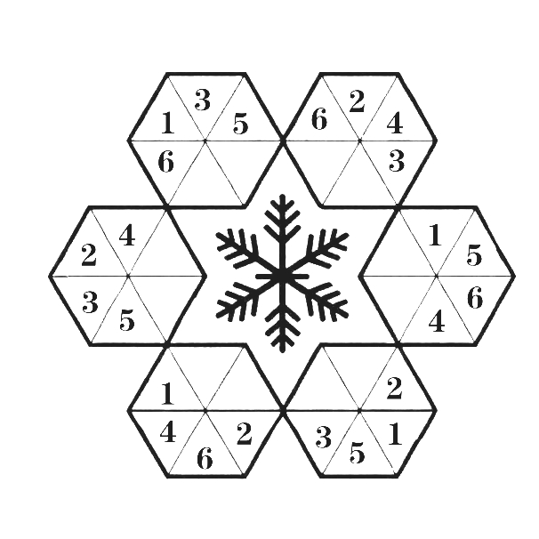 你的家乡飘起雪花了吗?来给这朵晶莹的雪花注入“数字魔力”——在雪花周围的空格中,填入1-6这六个数字,每个数字只能用一次。要让每一个小正六边形里,还有大雪花的每一条横向、斜向直线上,都集齐不重复的1-6。一起在感受冬日浪漫的同时,锻炼逻辑思维吧。